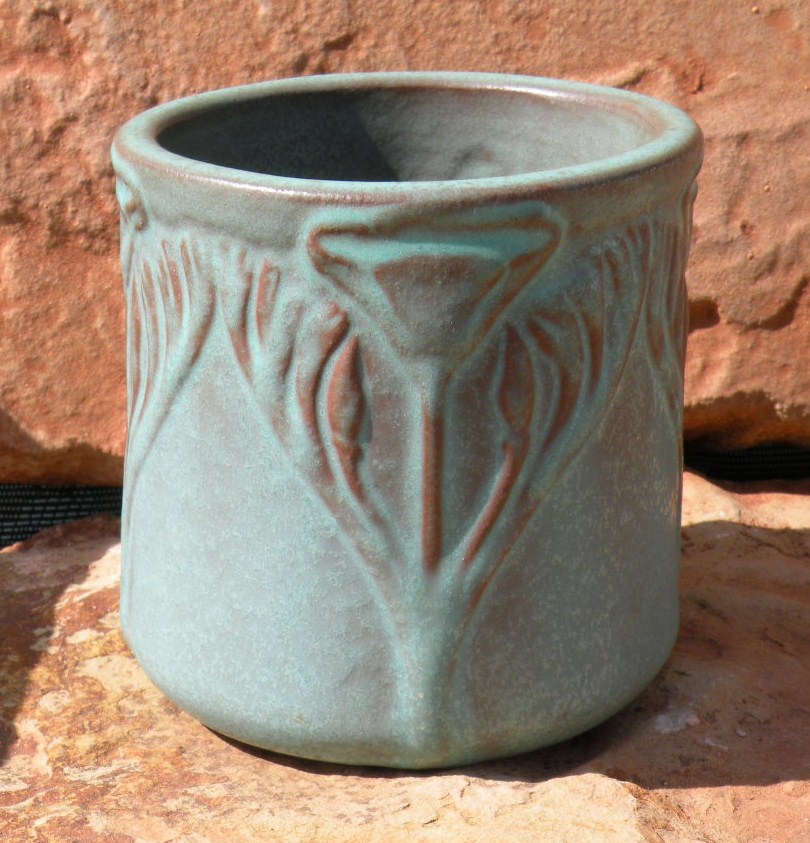 This Van Briggle piece has not previously been catalogued and recorded. It appears to be a Poppy Flower Design. The piece stands 4 1/4″ in height, and 4 1/4″ in diameter. The glaze is a beautiful green over dark chocolate clay; with the high points of the design showing the clay through the glaze.