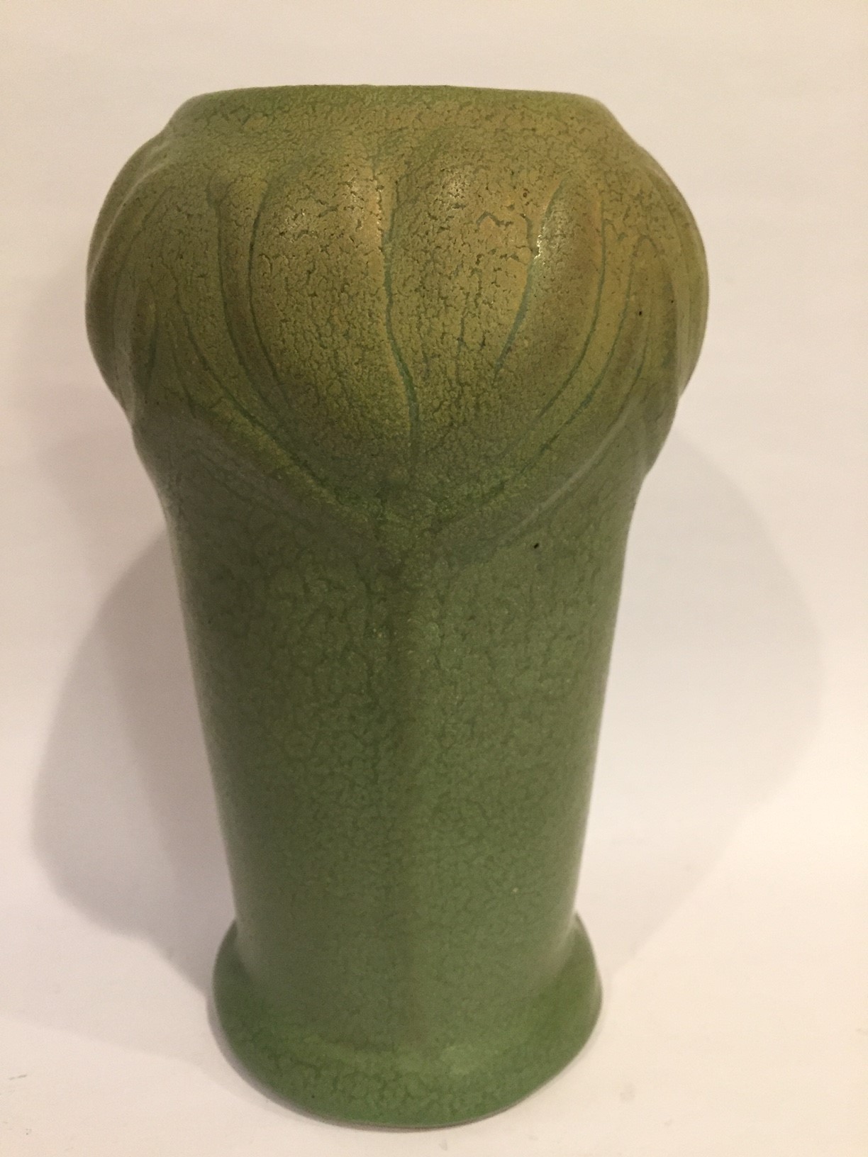 Description:  Design of large leaves around the top one third of the vase, covered in Olive Green glaze with beautiful curdled over spray.  Dark brown clay.  Double-A, Van Briggle, & date of 1906 all inscribed in the handwriting attributed to Anne Van Briggle.  Impressed Design #372.